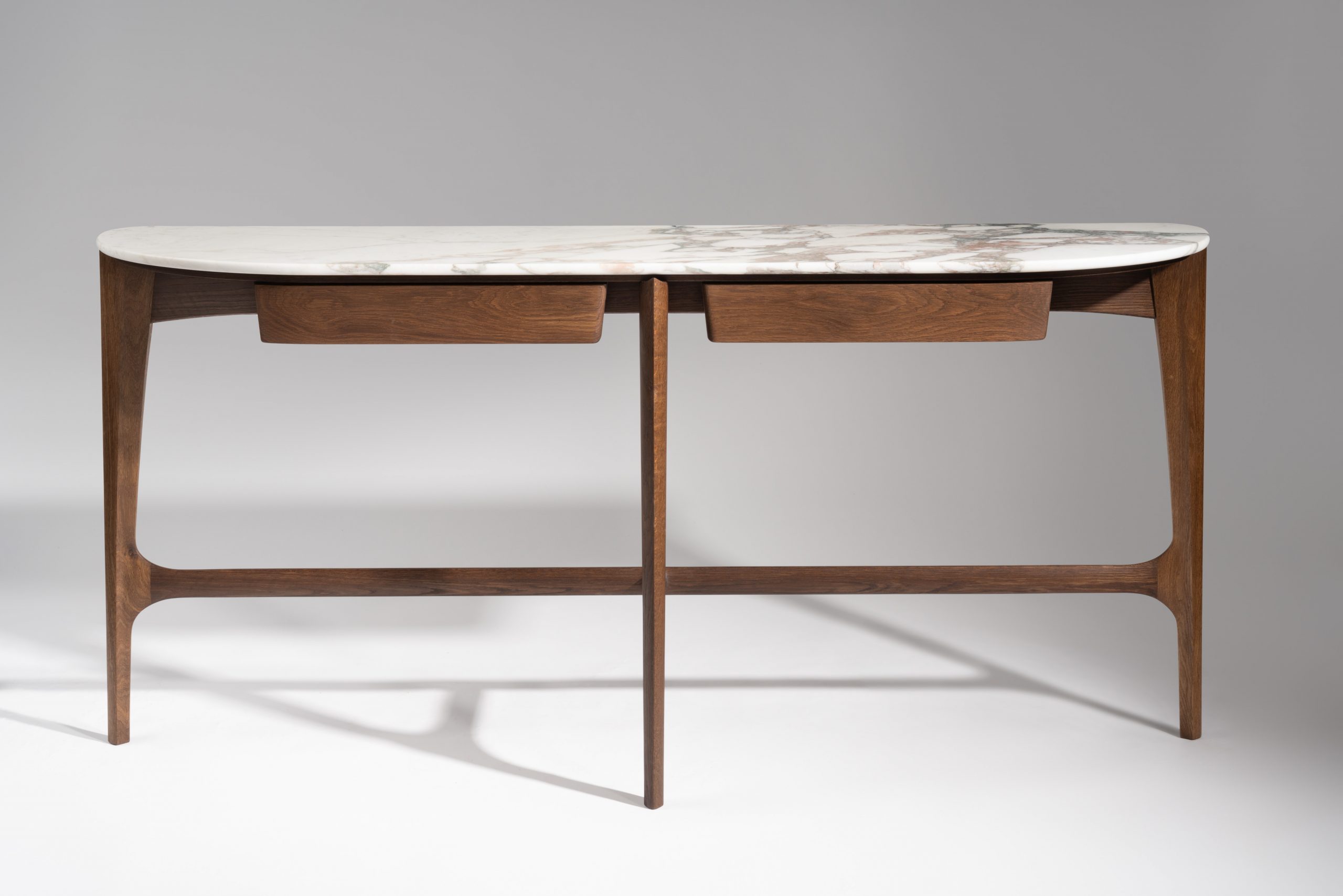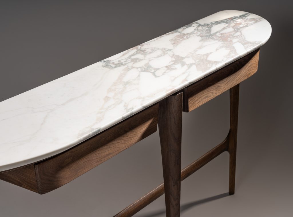 Created for a client who wanted a statement piece for their hallway, this commission combines the slim and elegant form of our Langford Console with a striking Calacatta Vagli marble top. This piece is ideal for hallways, entrance ways, or living areas. Hand shaped legs catch the light and reveal a different profile from every angle.